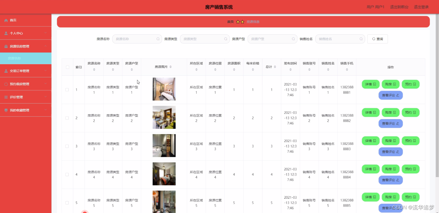房源信息管理:通过列表可以获取房源名称、房源类型、房源户型、房源图片、所在区域、房源位置、房源面积、每米价格、总计、发布时间、销售账号、销售姓名、销售手机等信息,进行详情、购房、预约、查看评论等操作,如图所示: