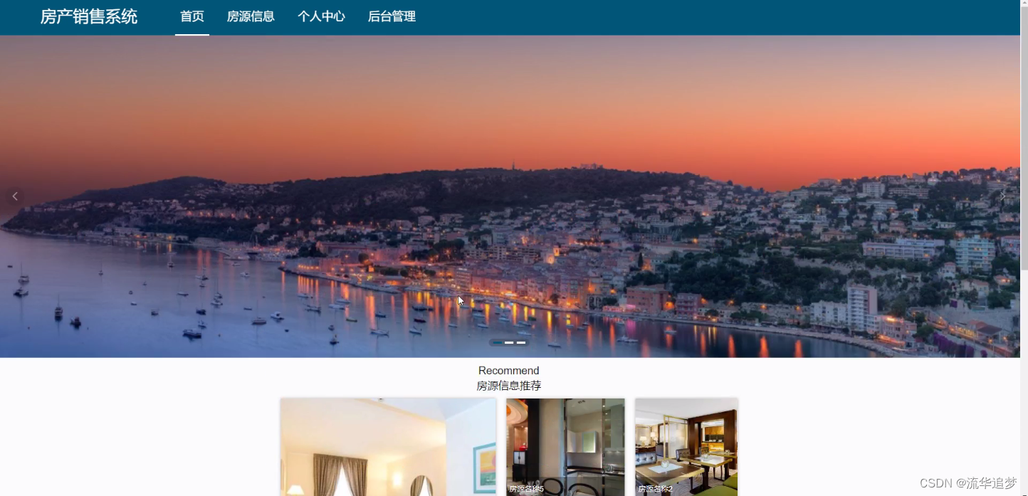 房产销售系统,在前台首页可以查看首页、房源信息、个人中心、后台管理等内容,如图所示: