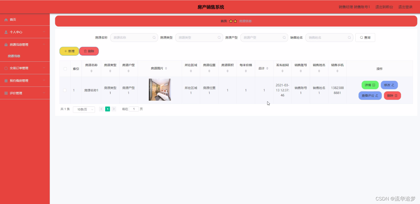 房源信息管理:通过列表可以获取房源名称、房源类型、房源户型、房源图片、所在区域、房源位置、房源面积、每米价格、总计、发布时间、销售账号、销售姓名、销售手机等信息,进行详情、修改、查看评论、删除等操作,如图所示: