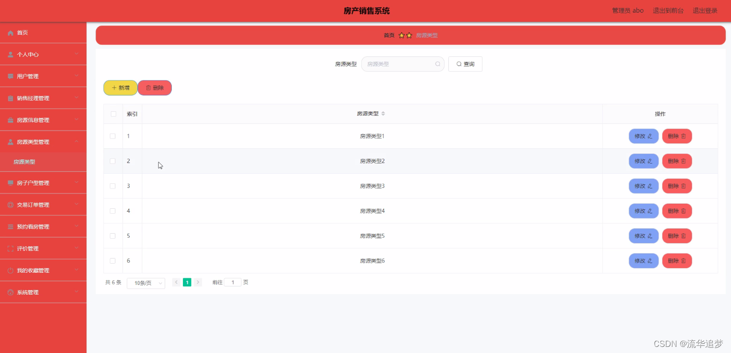 房源类型管理:通过列表可以获取房源类型等信息,进行修改或删除操作,如图所示: