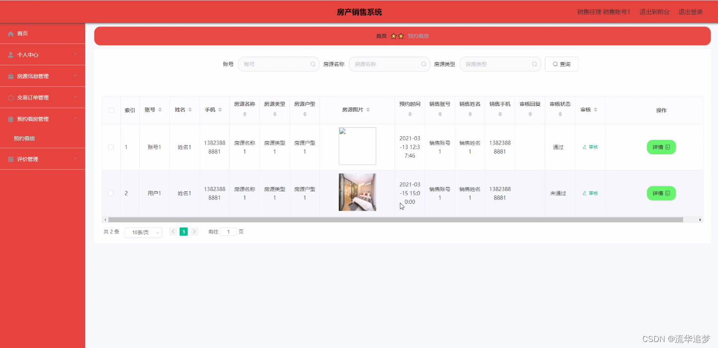 预约看房管理:通过列表可以获取账号、姓名、手机、房源名称、房源类型、房源户型、房源图片、预约时间、销售账号、销售姓名、销售手机、审核回复、审核状态等信息,进行详情、修改、删除操作,如图所示: