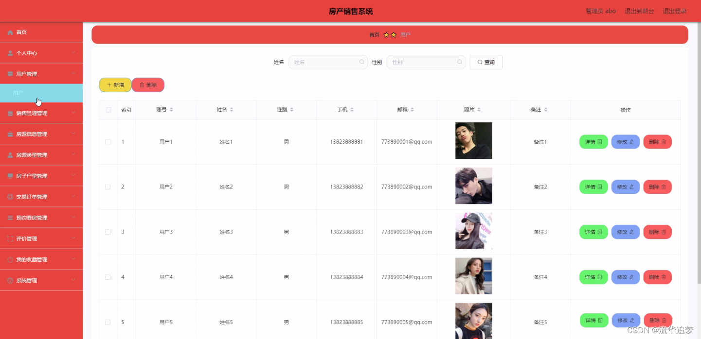 用户管理:通过列表可以获取账号、姓名、性别、手机、邮箱、照片、备注等内容,可以进行详情、修改或删除等操作,如图所示: