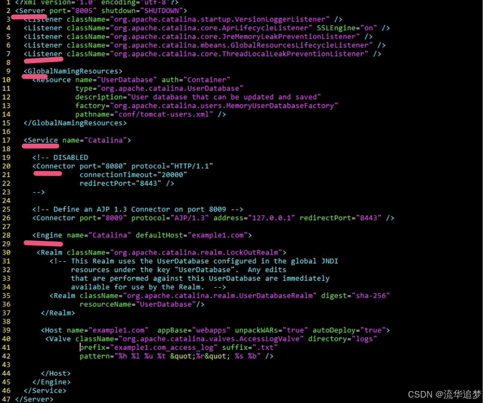 Server:表示服务器,它提供了一种优雅的方式来启动和停止整个系统,不必单独启停连接器和容器;它是 Tomcat 构成的顶级构成元素,所有一切均包含在 Server 中;