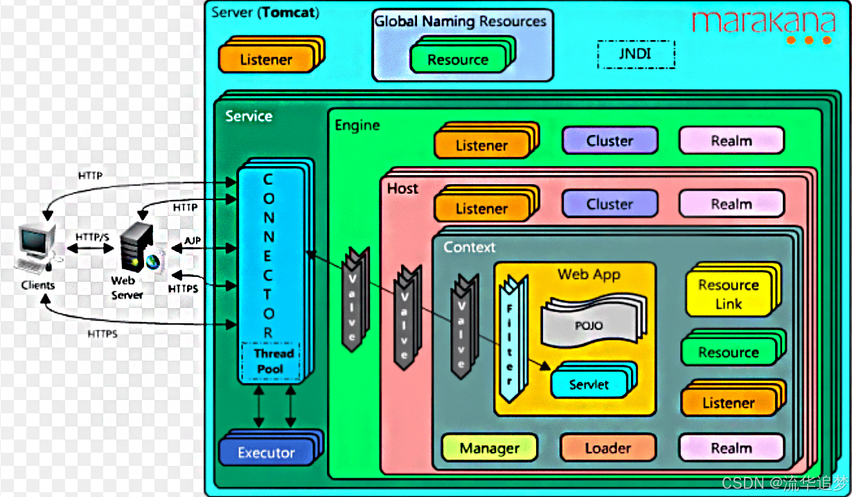 Service:表示服务,Server 可以运行多个服务。比如一个 Tomcat 里面可运行订单服务、支付服务、用户服务等等;Server 的实现类 StandardServer 可以包含一个到多个 Services, Service 的实现类为 StandardService 调用了容器(Container)接口,其实是调用了 Servlet Engine(引擎),而且 StandardService 类中也指明了该 Service 归属的 Server;