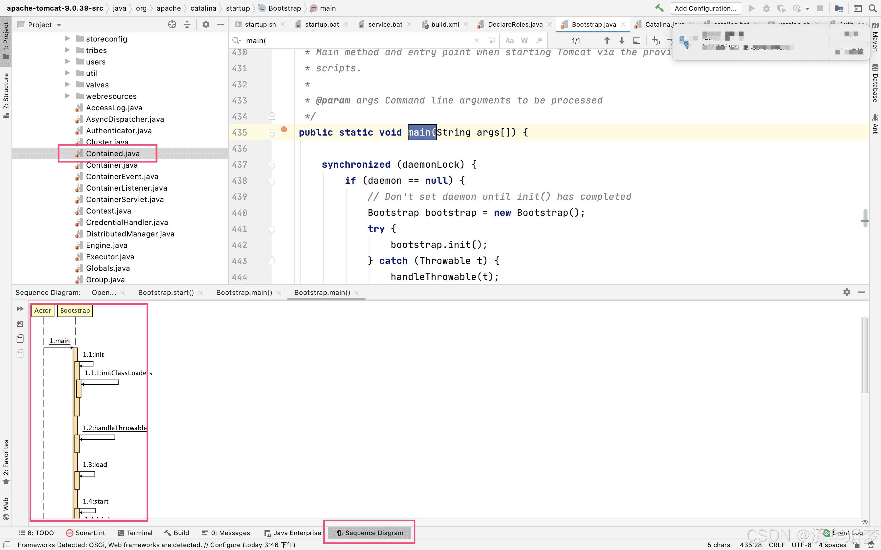 我们用 Sequence Diagram 插件来看 main 方法的时序图,但是可以发现它并没有帮我们画出Bootstrap 初始化 Catalina 的过程,这和上面的组件初始化不符合?