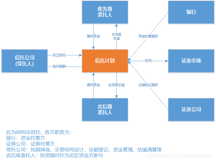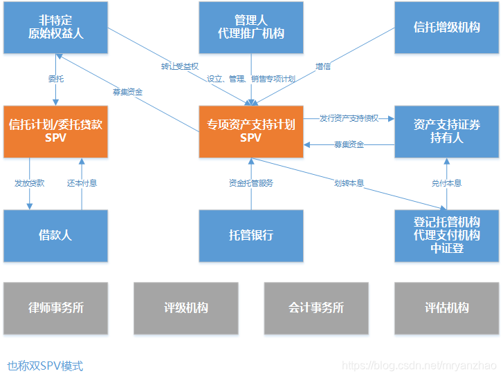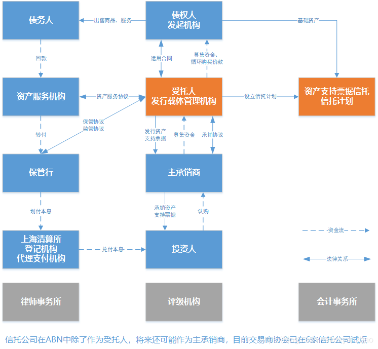 - 交易所发行的资产证券化业务:信托公司向底层资产发放贷款=>委托人将持有信托受益权,作为基础资产发行ABS(实际是通道业务,目前分类在资产证券化业务)。
