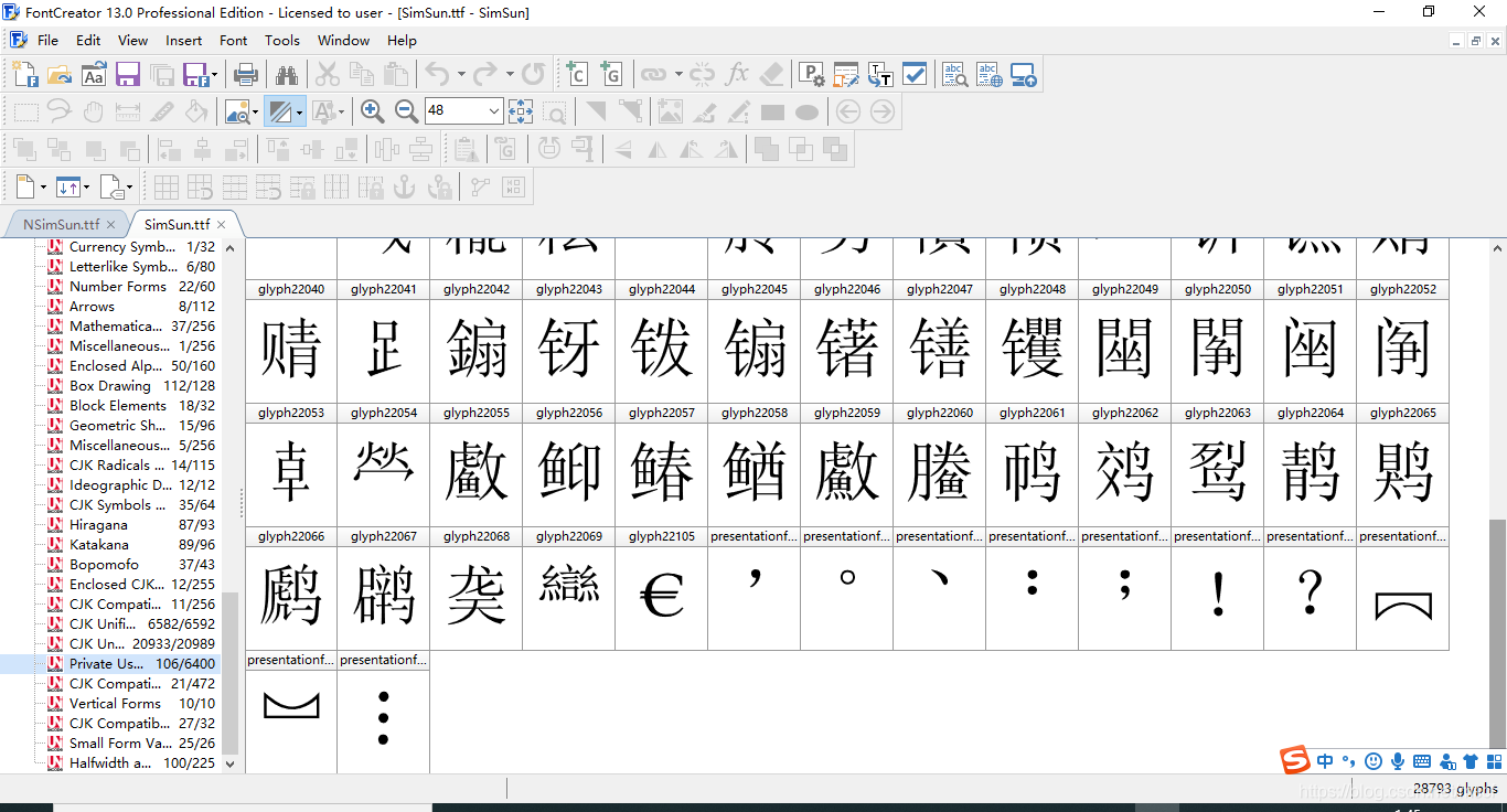 软件操作就不赘述了,界面还是比较友好的,编辑结束后将两个TTF文件各自导出,覆盖原先摘取的文件,接着用otf2otc将这两个文件合并。