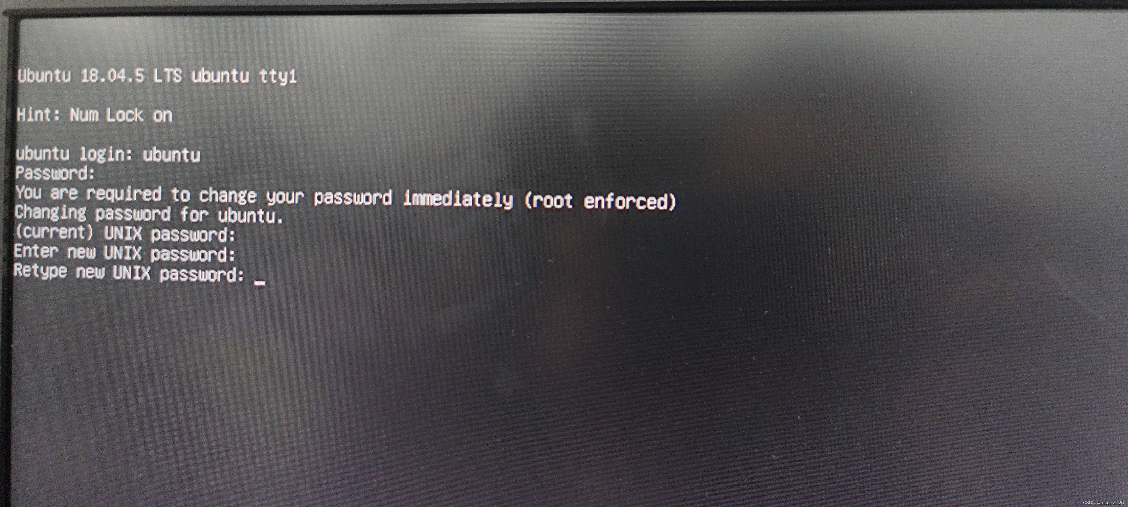 4.打开系统:SD卡插入树莓派并开机,输入login:ubuntu,password:ubuntu,(current)password:ubuntu,new password:自己定,我的是raspi123.