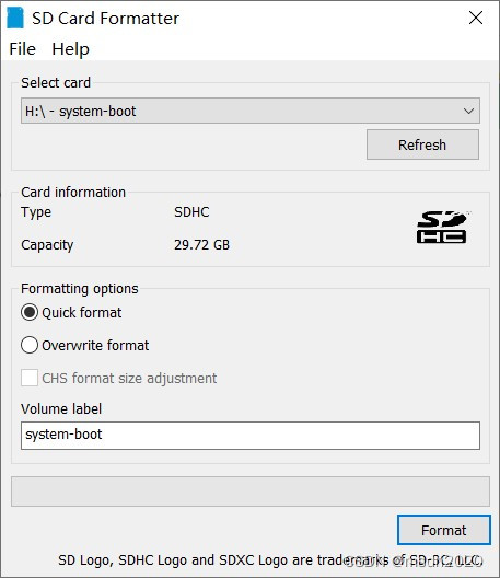 2.格式化SD卡:我的SD卡之前有系统,所以包括J盘H盘,选择你的磁盘用SD Formaer格式化