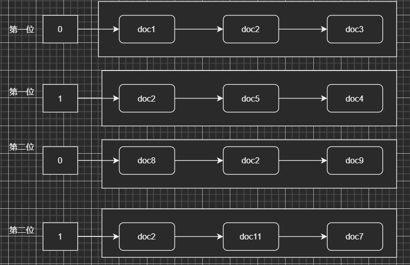 按照上文中计算SimHash函数后,我们每个文章都得到了一个64位的编码,那么如何判断文章的相似性那,最简单的想法是我们先以每位的值为key,文章的ID的列表作为值,做成一个倒排索引。每位有2个值,64位,所以一共有128个key,值为一个个docId组成的Postlist。假如我们得到一个文章的编码后,比如<1,1,0,0>,按照每一位作为key去倒排索引中查找所有的Postlist,然后比对两个文档中的其他位数是否相同,如果差异的位数小于我们规定的海明距离,则说明两个文档相似。