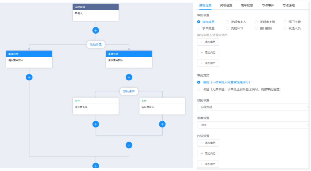 平台用户自定义审批流程,可根据利润区间或产品线等条件配置不同的审批路线或者是级别