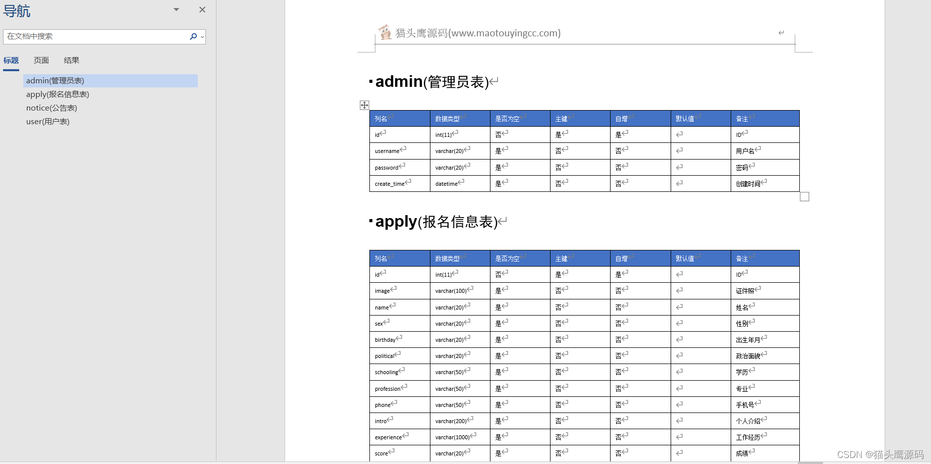 数据库表结构文档: