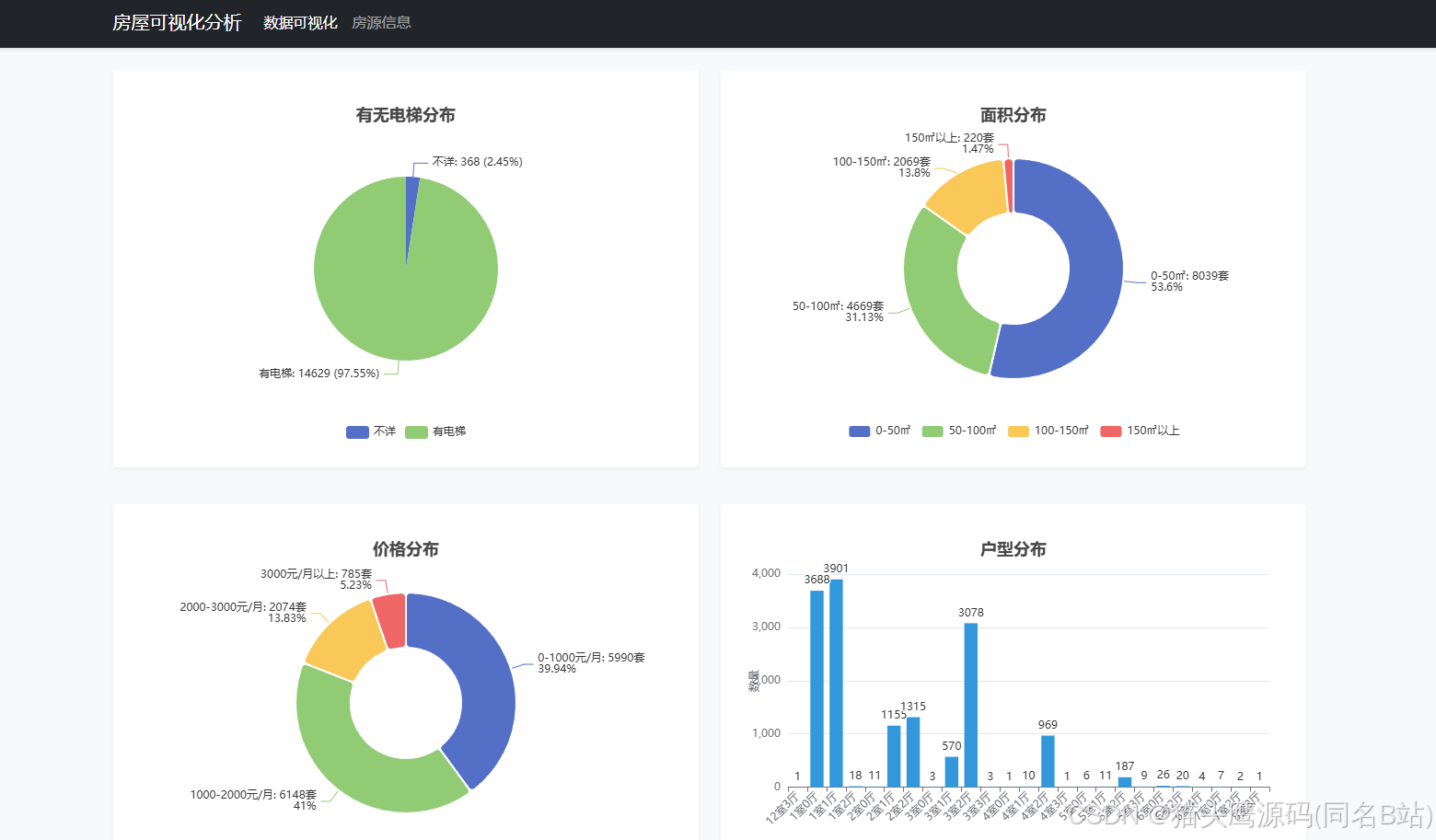 - 电梯分布:饼状图展示有无电梯的房源分布