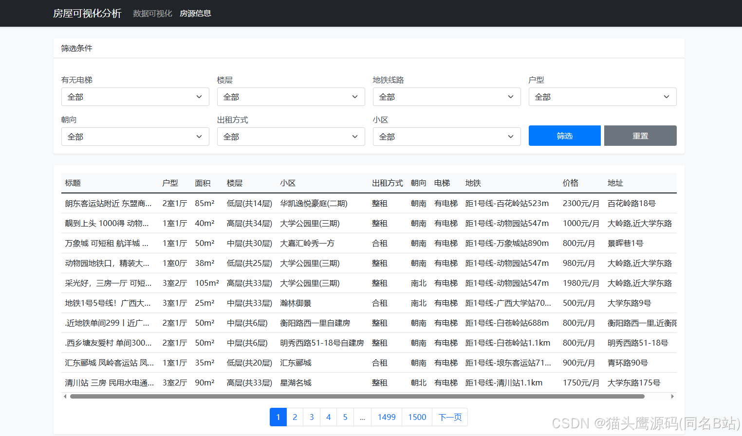 本系统为最新原创项目,项目代码工整,结构清晰,适合选题:房屋信息、房屋、可视化、房屋统计等其他旅游分析话题等,系统采用flask开发,前端主要使用了html。