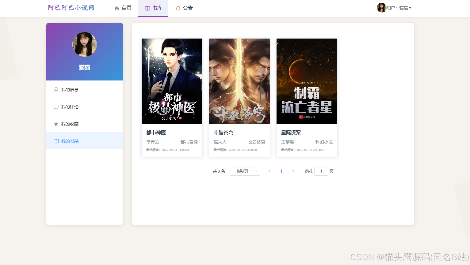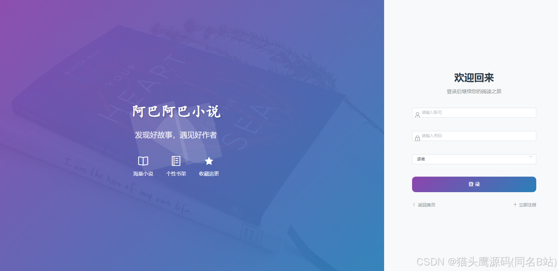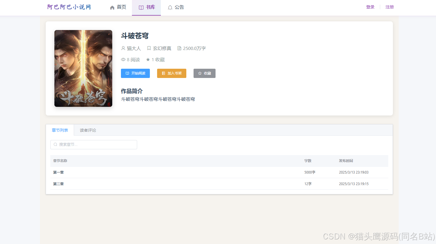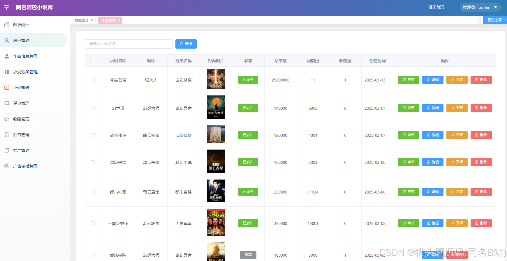 本系统为最新原创项目,采用前后端分离,创作于2025,项目代码工整,结构清晰,适合选题:小说阅读、小说、阅读、小说阅读网、小说网、前后端分离类其他小说话题等。系统采用springboot+vue整合开发,前端主要使用了vue、项目后端主要使用了springboot,数据层采用mybatis。