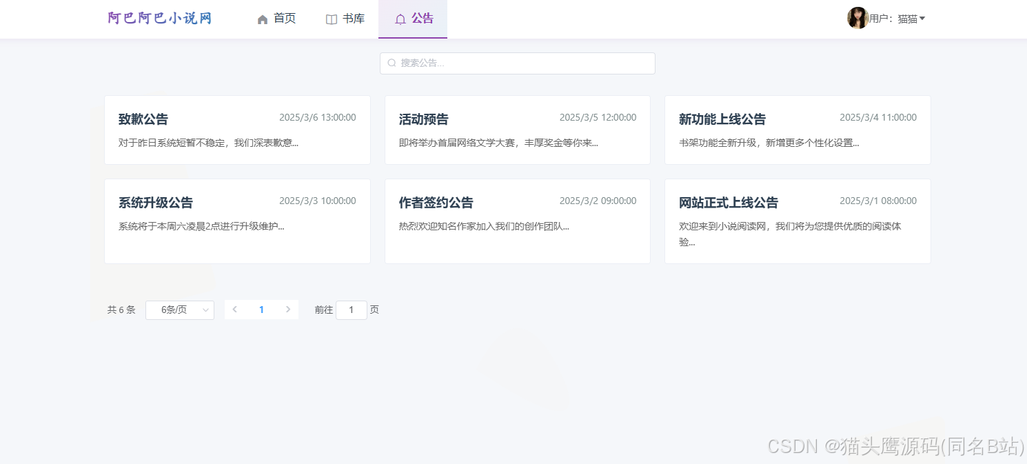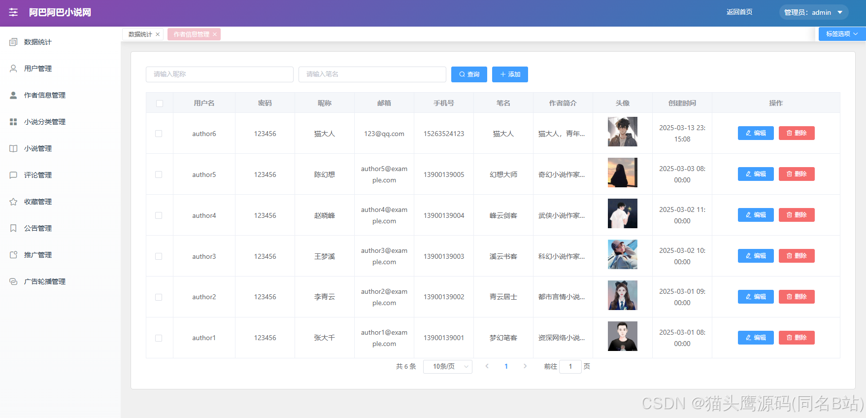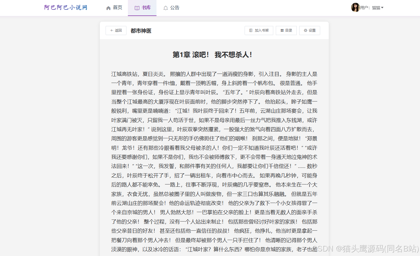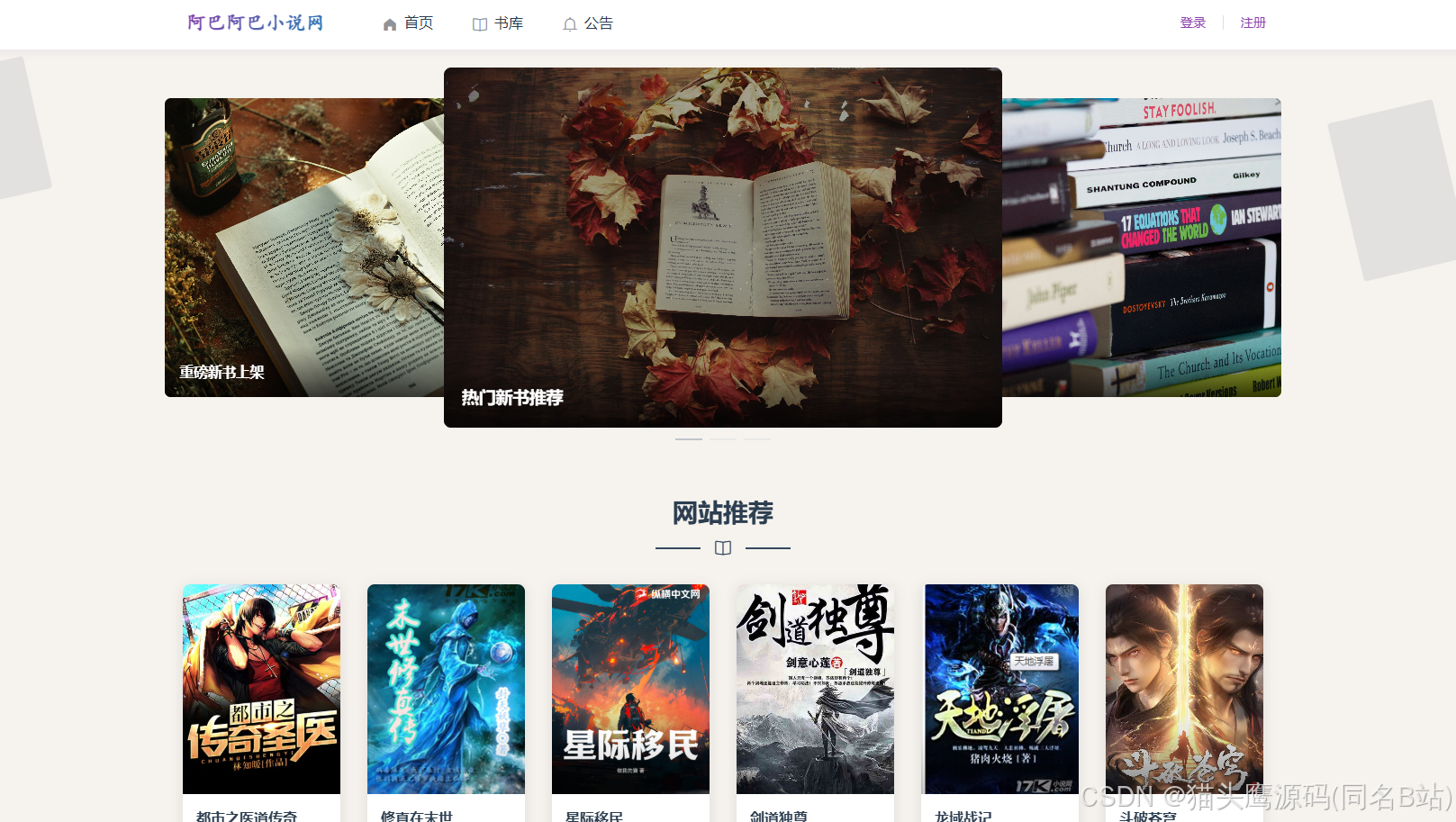 本系统为最新原创项目,采用前后端分离,创作于2025,项目代码工整,结构清晰,适合选题:小说阅读、小说、阅读、小说阅读网、小说网、前后端分离类其他小说话题等。系统采用springboot+vue整合开发,前端主要使用了vue、项目后端主要使用了springboot,数据层采用mybatis。