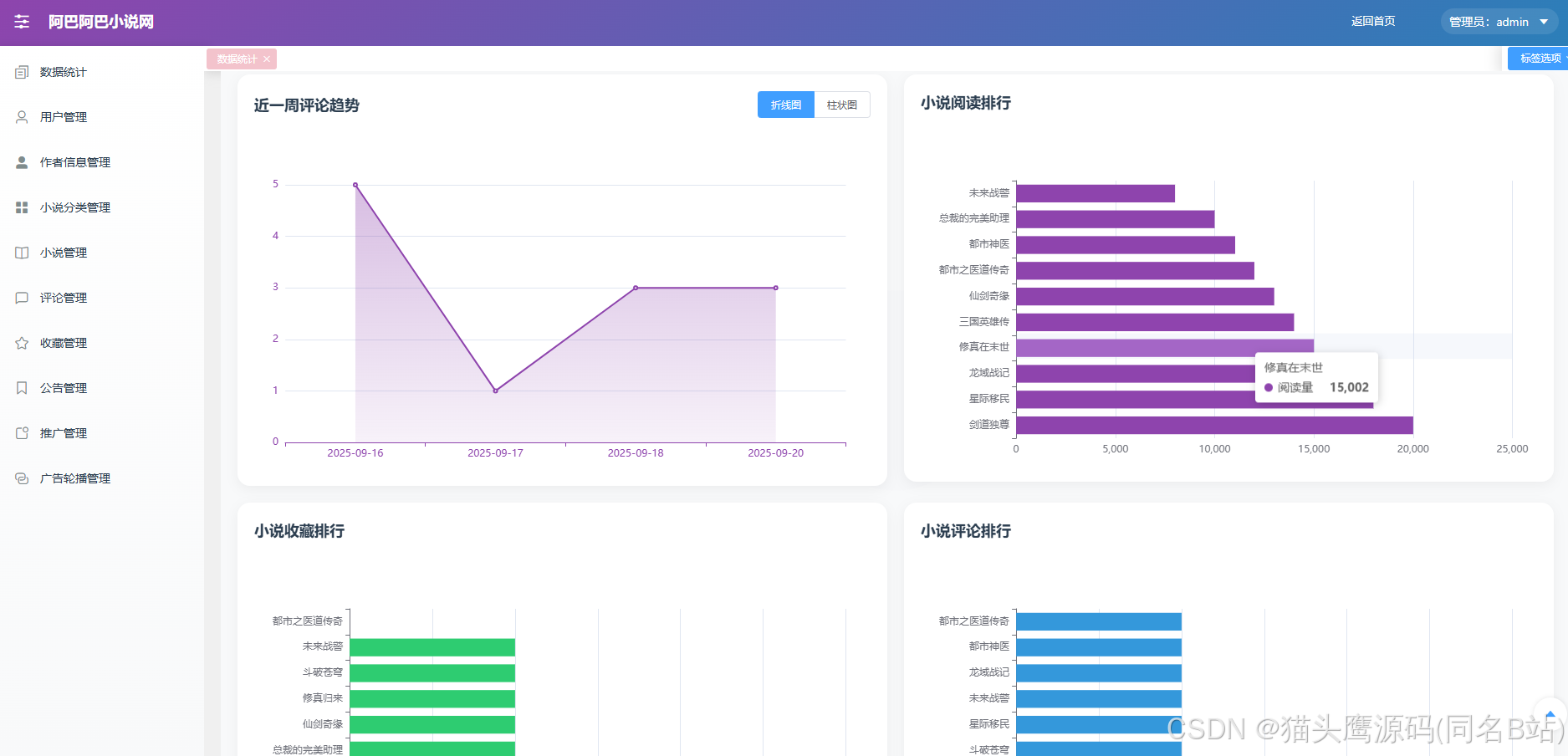 数据统计:统计用户数、小说数,评论数,统计各个小说的阅读量和收藏量
