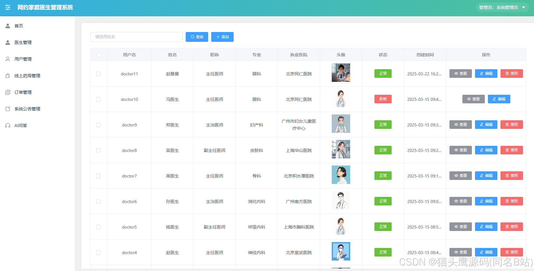 医生管理:审核医生的注册请求。管理医生的个人信息,包括姓名、职称、专业、执业地点等,对违规医生进行封禁。