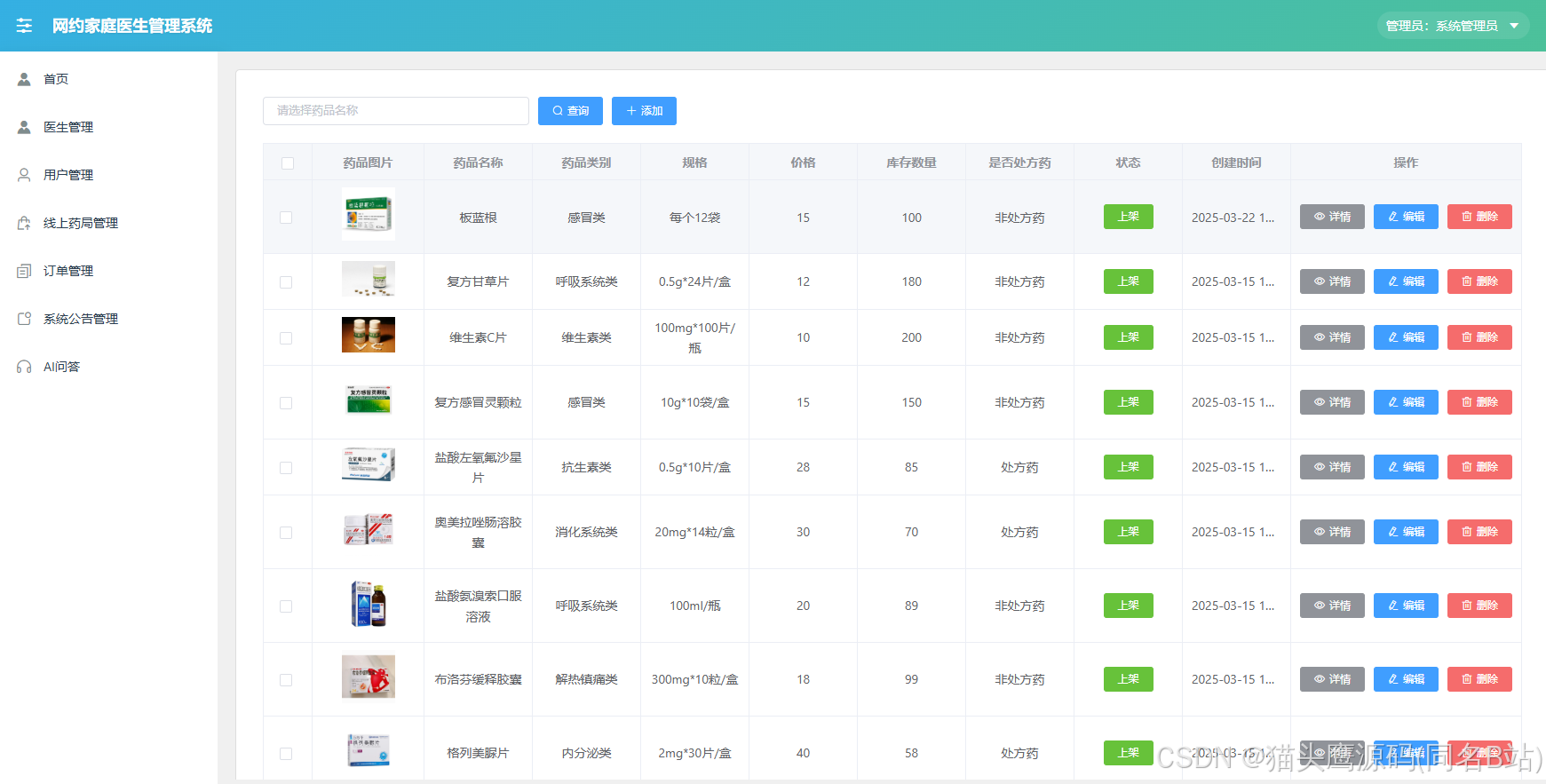 线上药局管理: 对药物品类、价格、规格、库存、是否处方药等字段进行维护