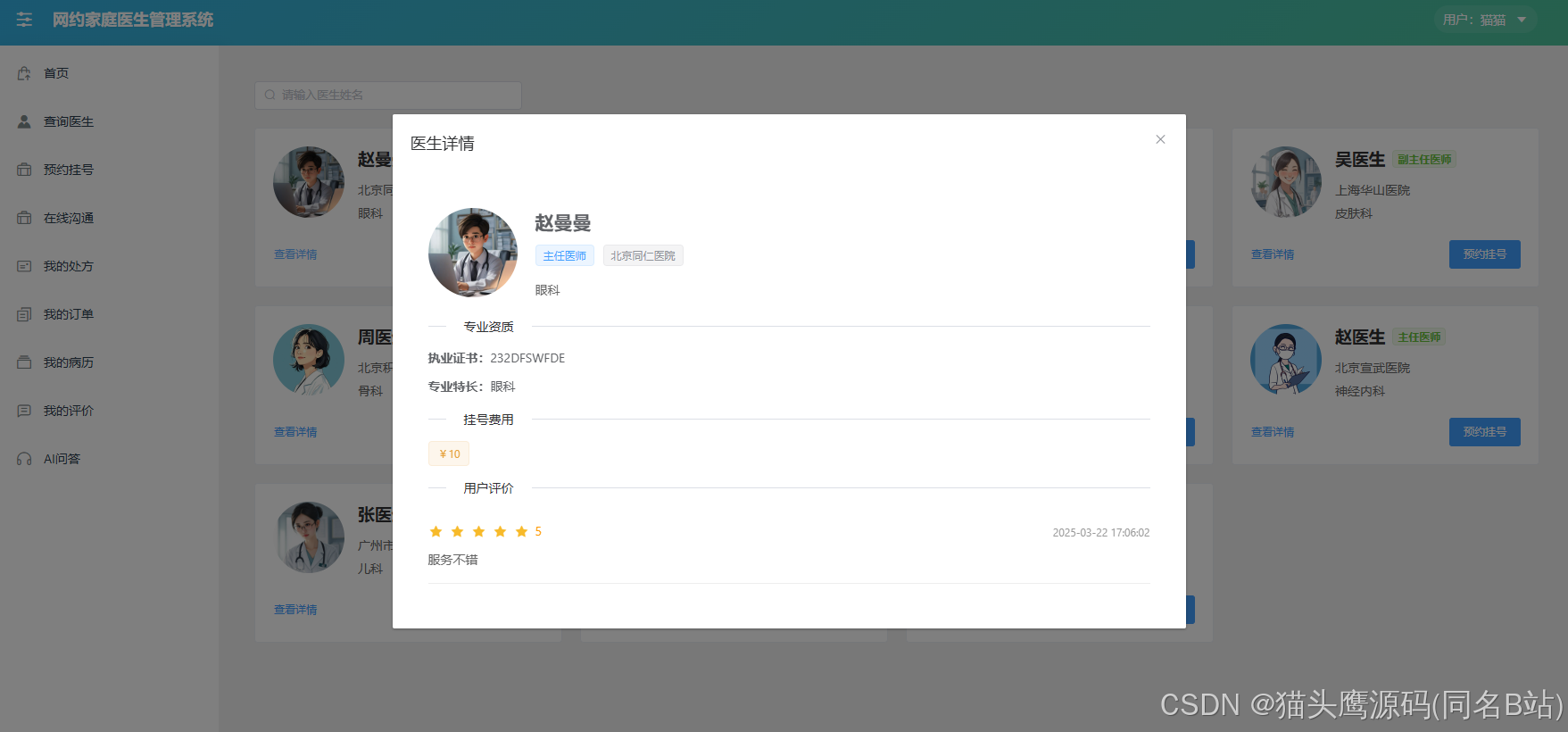 查询医生:用户可以根据自己的需求搜索合适的家庭医生,并查看医生的详细信息,如专业资质和服务评价以及主治方向。