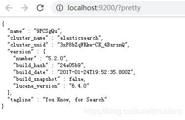 浏览器输入http://localhost:9200/?pretty即可初步访问,pretty会让Elasticsearch美化输出(pretty-print)JSON响应以便更加容易阅读。