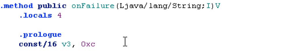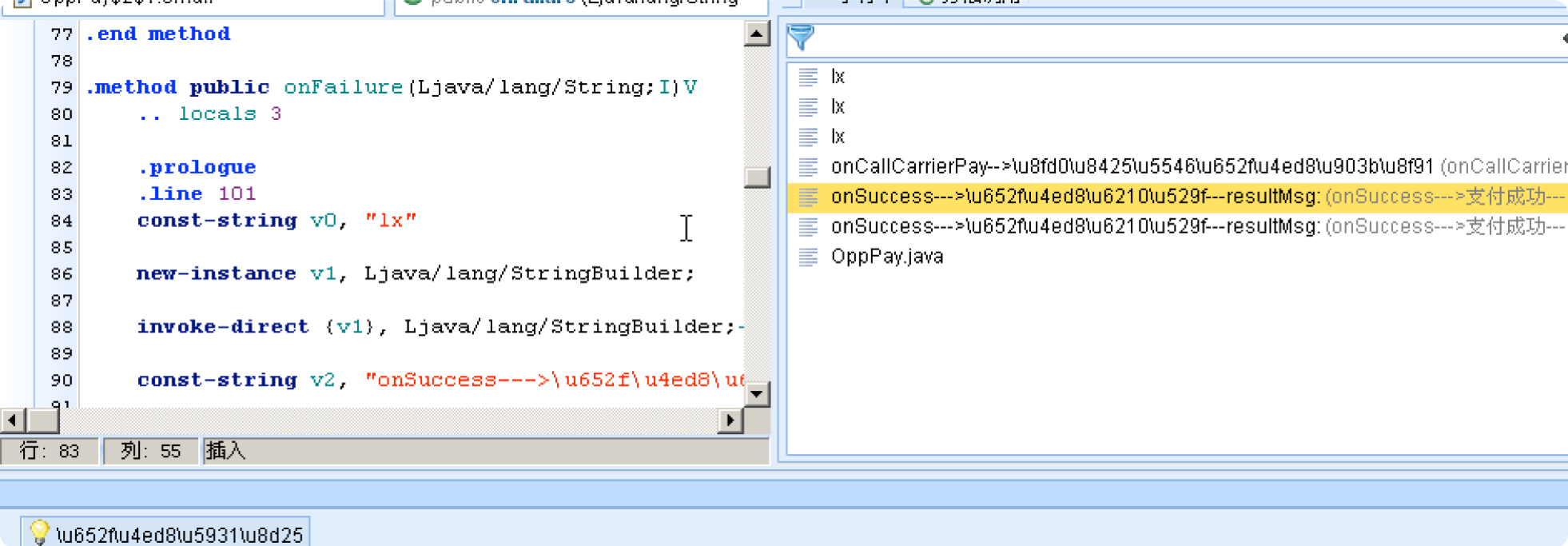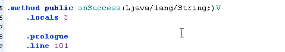 即方法声明(.method public onSuccess)这一句不能替换(刚开始全部替换了....生成的apk运行之后,点击取消支付程序会闪退)