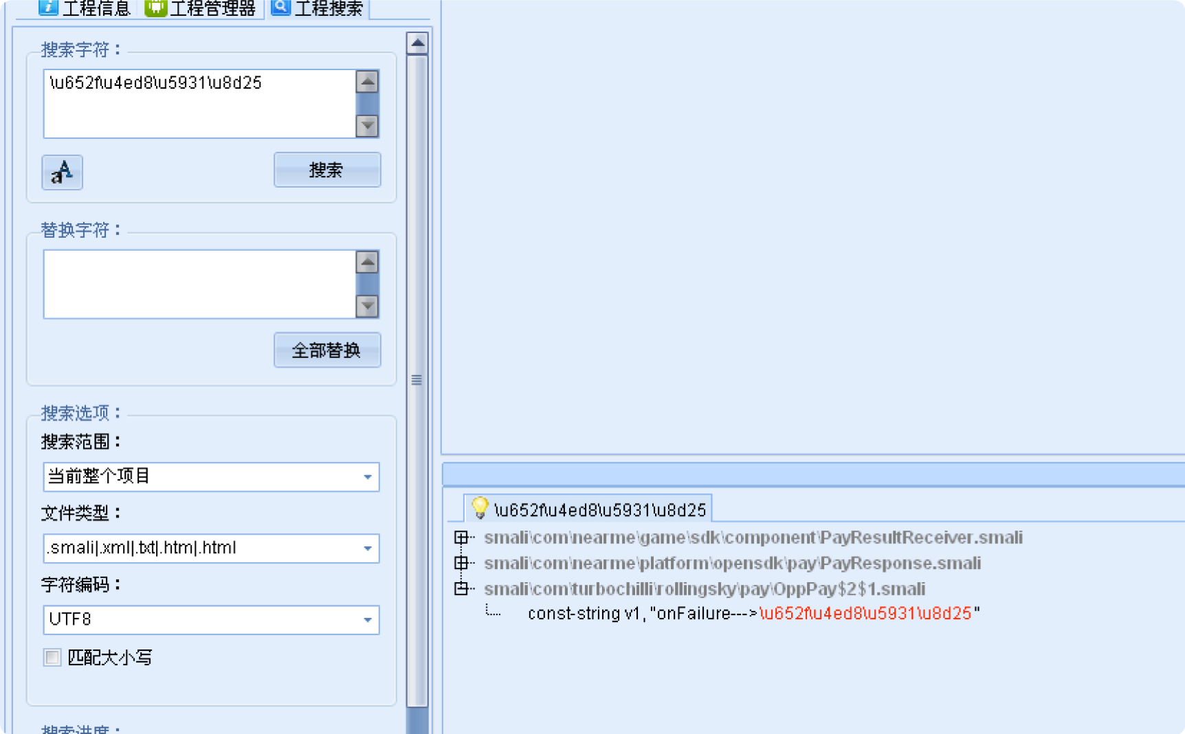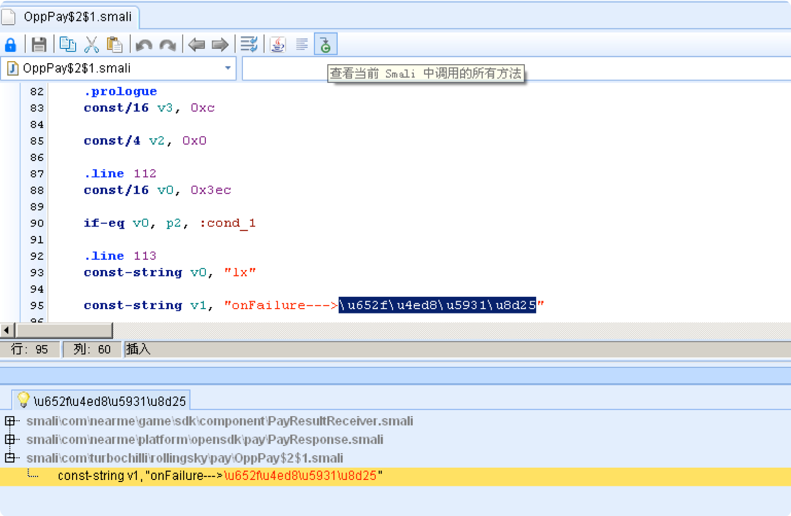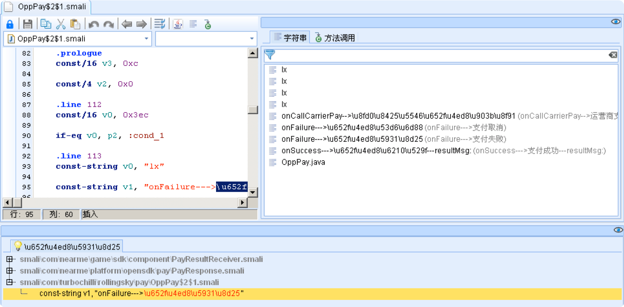 3、选择可能的相关支付代码,双击进入查看方法和字符串