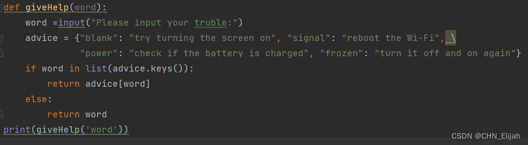 在下一个区块中,编写一个函数giveHelp(),它接收一个文本字符串和建议字典作为参数,找出该字符串中的哪些关键词("空白"、"信号 "等),然后返回一个包含所有匹配建议的字符串,每个建议都在自己的行中。如果一个词是重复的,建议应该只给出一次。