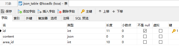 数据表结构,主要是注意json格式,mysql版本5.7.其他字段自己完善,这里只是演示一下。
