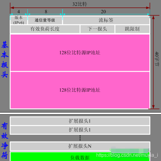有效负荷长度:在报头传输数据中,最大传输单元为1500字节,除去基本报头40字节和扩展报头,它的有效负荷长度为1500-40;如果有扩展报头,也需要算进去。
