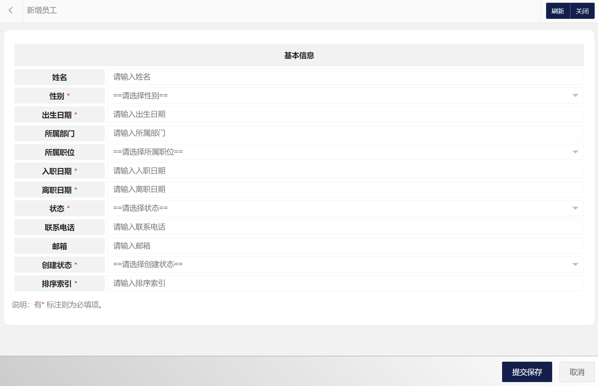 在员工列表中可以选择新增员工、编辑员工、删除员工、搜索员工等。员工属性包括:员工编码、姓名、性别、出生日期、所属部门、所属职位、入职日期、离职日期、状态、联系电话、邮箱等。新增员工界面如图所示: