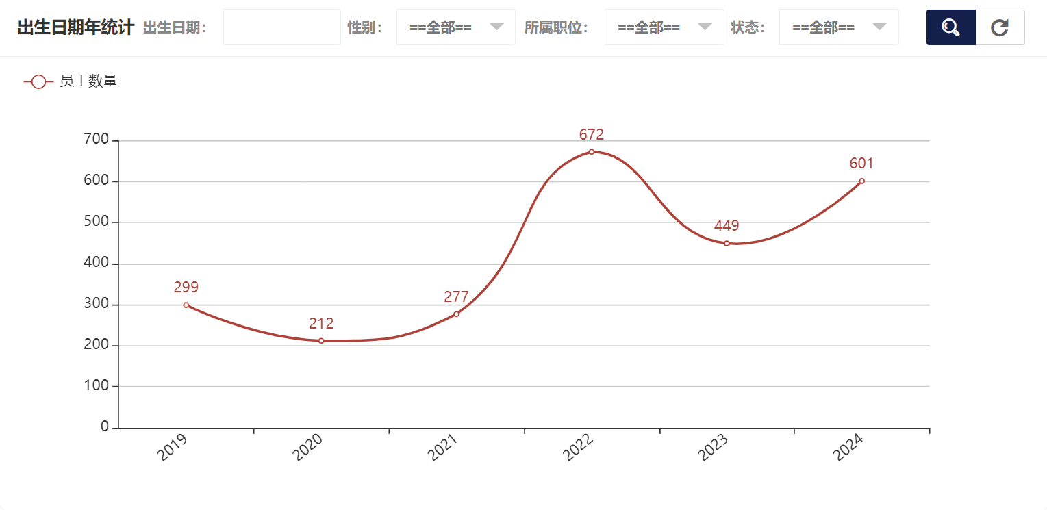 在员工统计中可以看到性别统计、出生日期年统计、出生日期月统计、出生日期日统计、所属职位统计、入职日期年统计、入职日期月统计、入职日期日统计、离职日期年统计、离职日期月统计、离职日期日统计、状态统计,出生日期年统计如图所示: