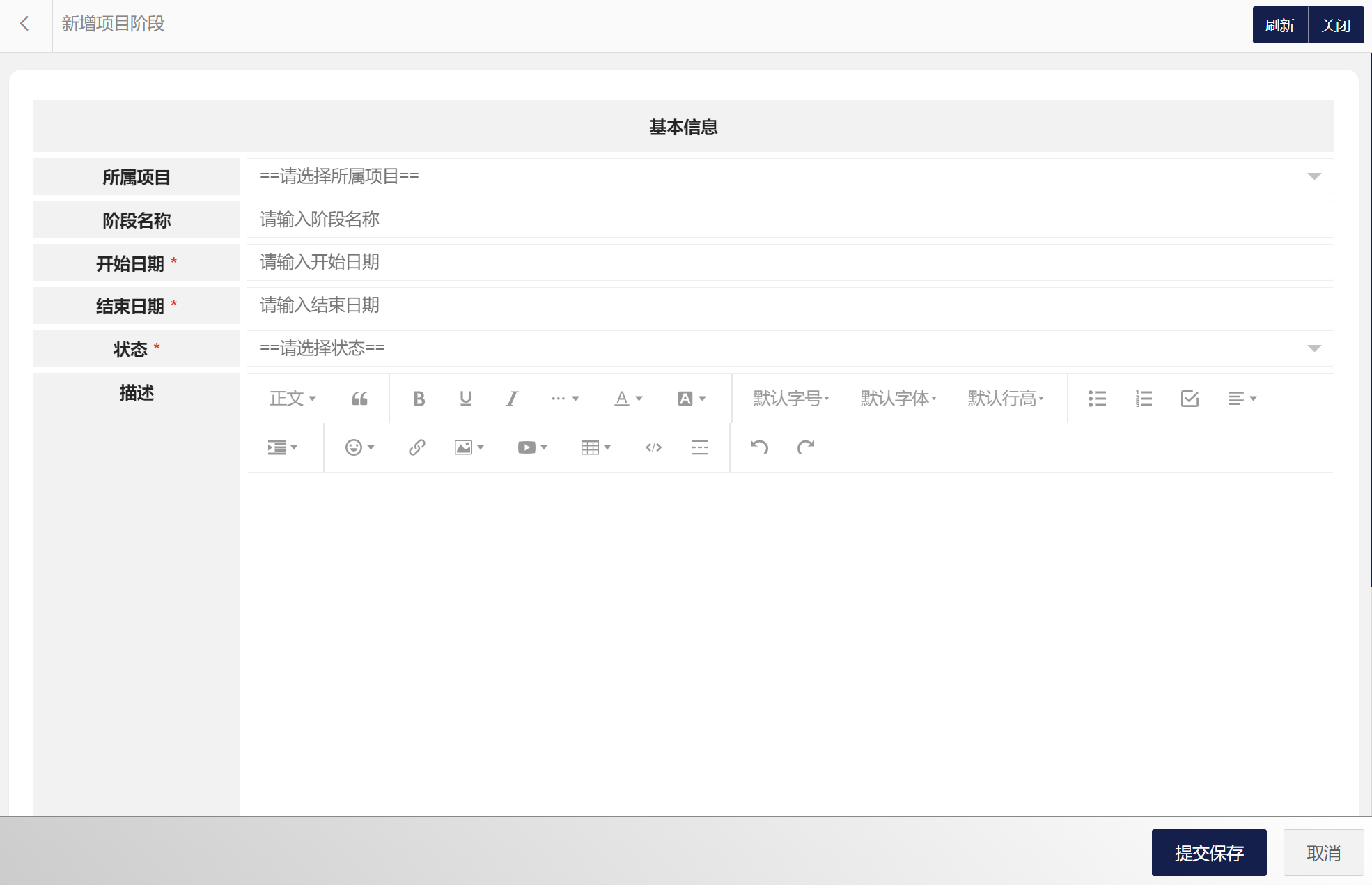 在项目阶段列表中可以选择新增项目阶段、编辑项目阶段、删除项目阶段、搜索项目阶段等。项目阶段属性包括:项目阶段编码、所属项目、阶段名称、开始日期、结束日期、状态、描述等。新增项目阶段界面如图所示:
