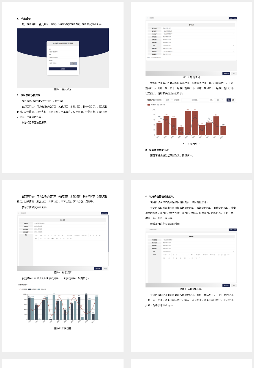 项目管理功能定义方面,从数据录入开始,普通员工需填写完整准确的字段信息如项目编码、名称及类型等;接着进行查询操作以获取所需项目的详细信息或统计结果,并支持按关键词模糊搜索。信息变更环节允许修改已存在的记录内容但保留历史版本以便追溯审计;部门领导则负责审核这些变动确保数据准确性与合规性,包括但不限于核对预算金额和项目进度状态。系统提供详尽的数据分析工具以供统计分析使用,如图表展示各项目的完成率、成本对比等关键指标,并支持导出为PDF或Excel文件方便进一步处理或存档。