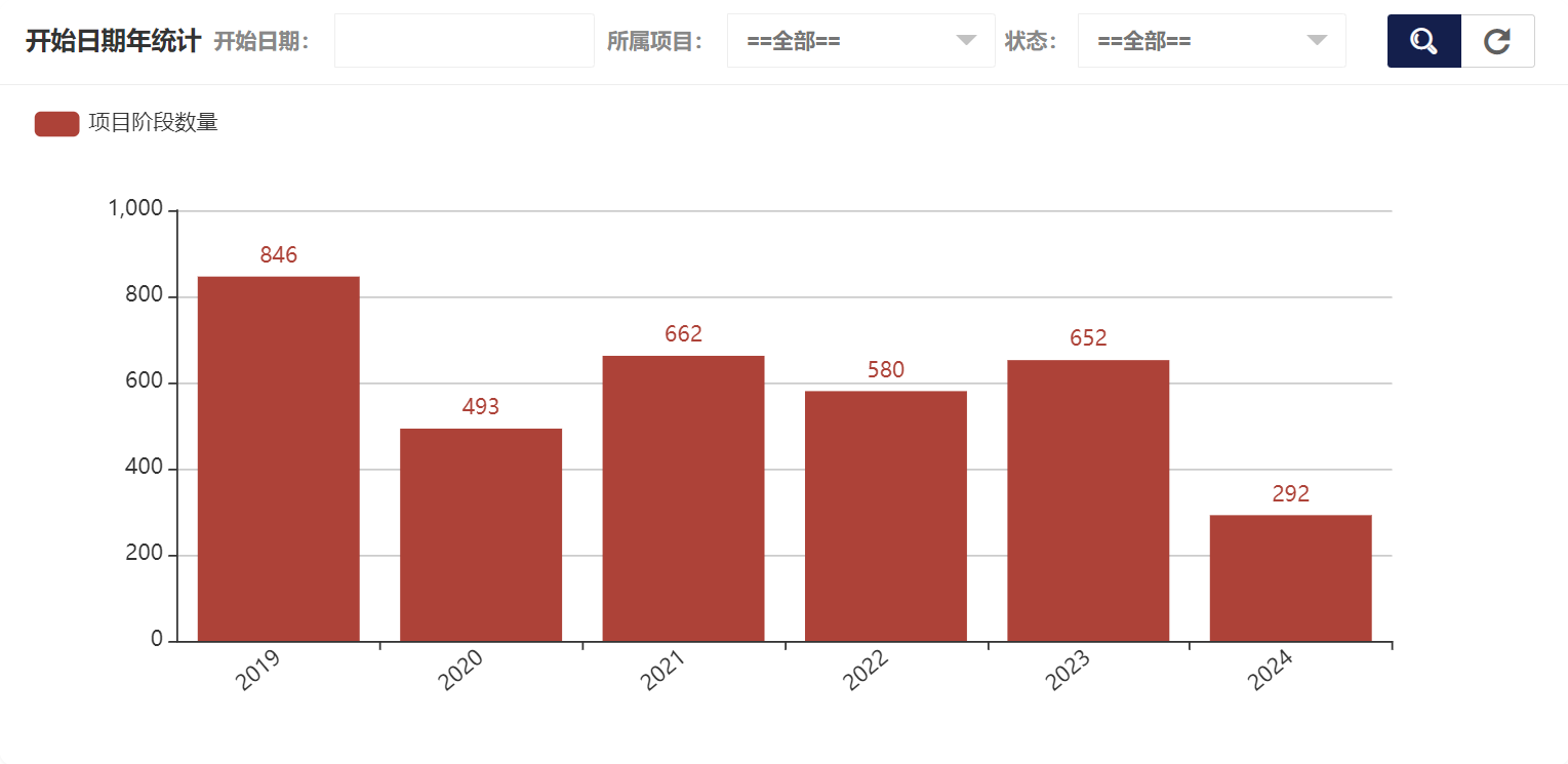 在项目阶段统计中可以看到所属项目统计、开始日期年统计、开始日期月统计、开始日期日统计、结束日期年统计、结束日期月统计、结束日期日统计、状态统计,开始日期年统计如图所示: