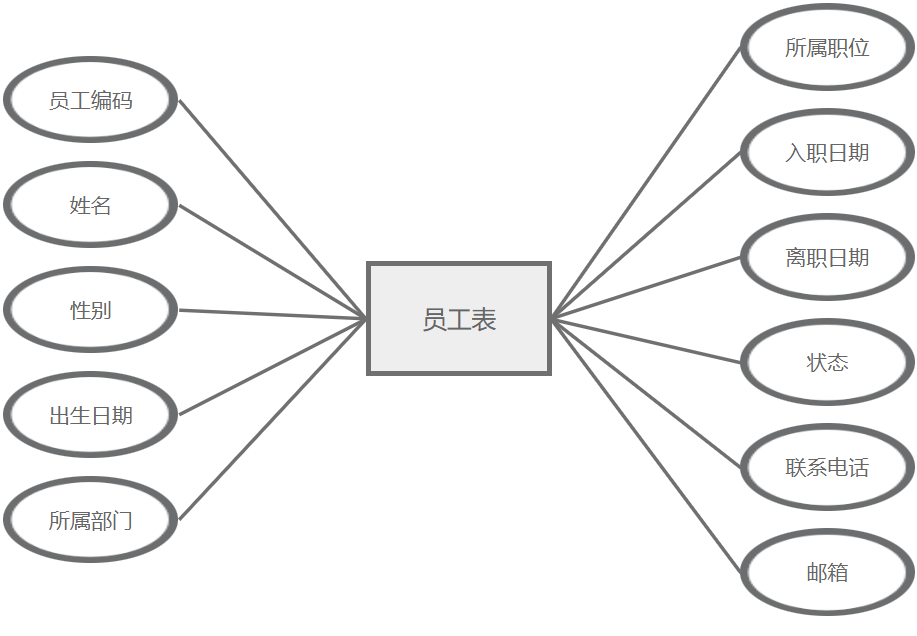 员工管理主要属性包括:员工编码、姓名、性别、出生日期、所属部门、所属职位、入职日期、离职日期、状态、联系电话、邮箱。