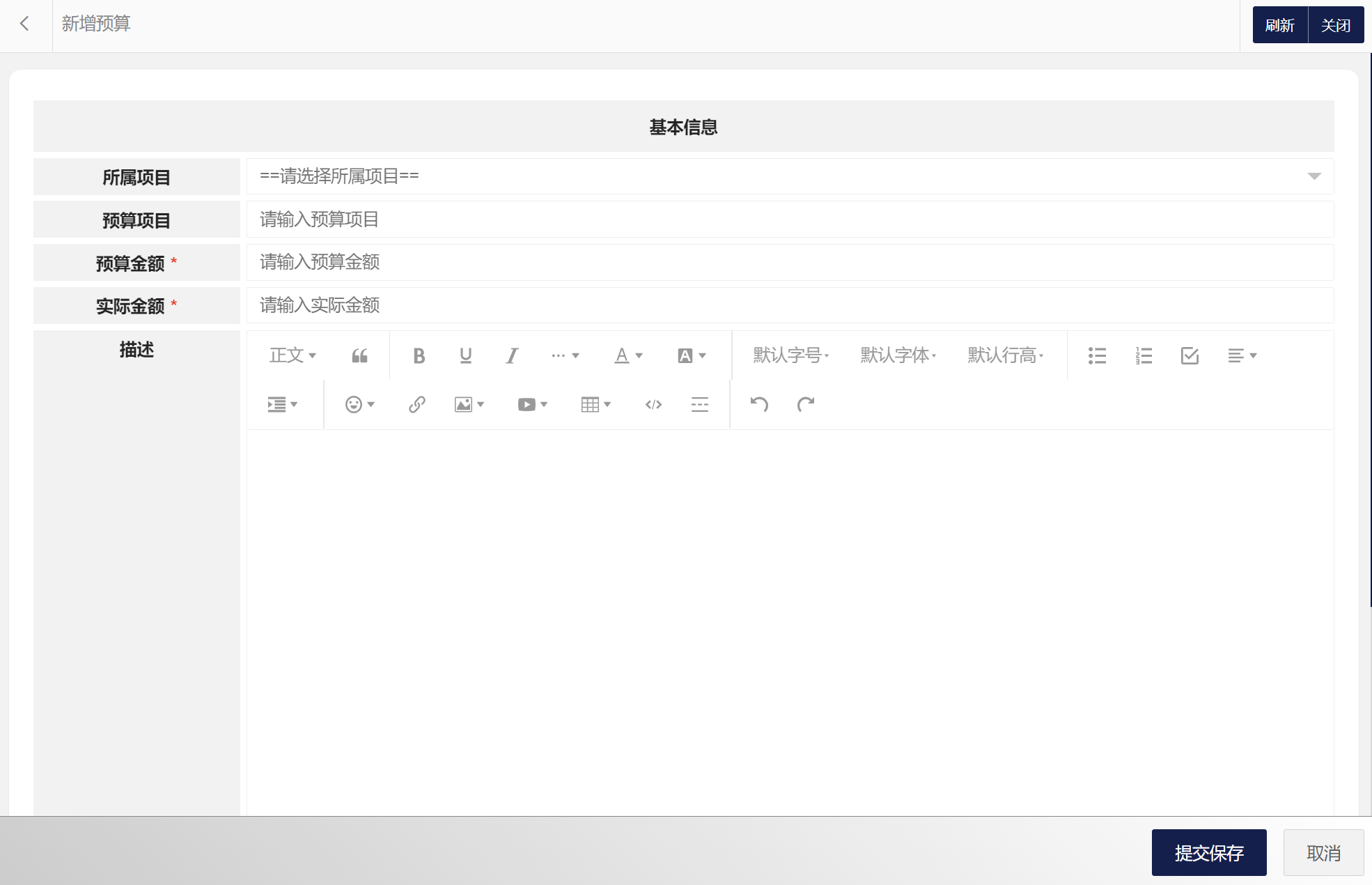 在预算列表中可以选择新增预算、编辑预算、删除预算、搜索预算等。预算属性包括:预算编码、所属项目、预算项目、预算金额、实际金额、描述等。新增预算界面如图所示:
