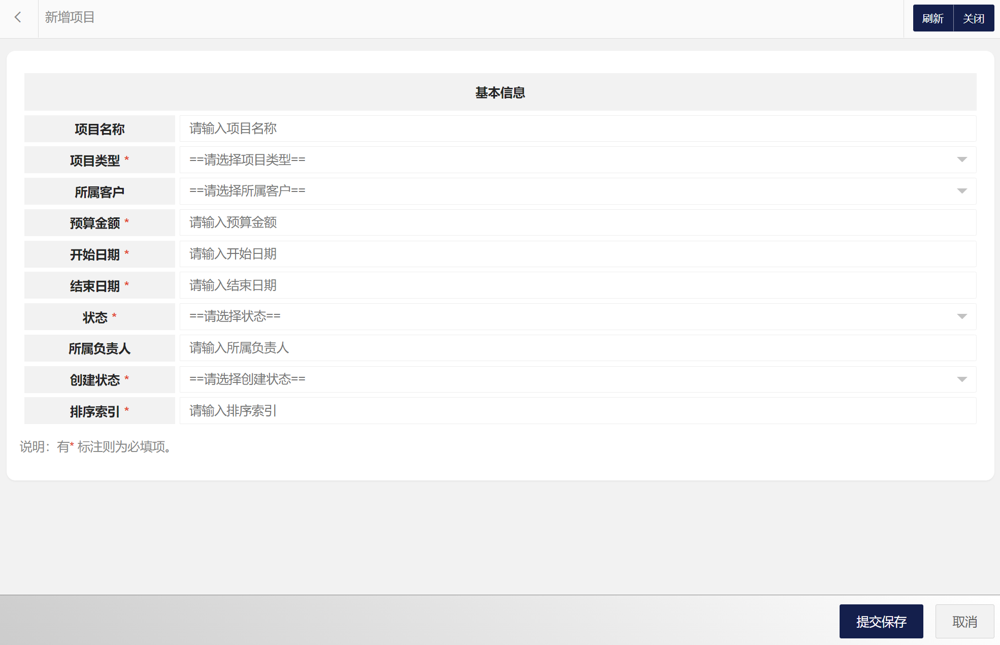 在项目列表中可以选择新增项目、编辑项目、删除项目、搜索项目等。项目属性包括:项目编码、项目名称、项目类型、所属客户、预算金额、开始日期、结束日期、状态、所属负责人等。新增项目界面如图所示: