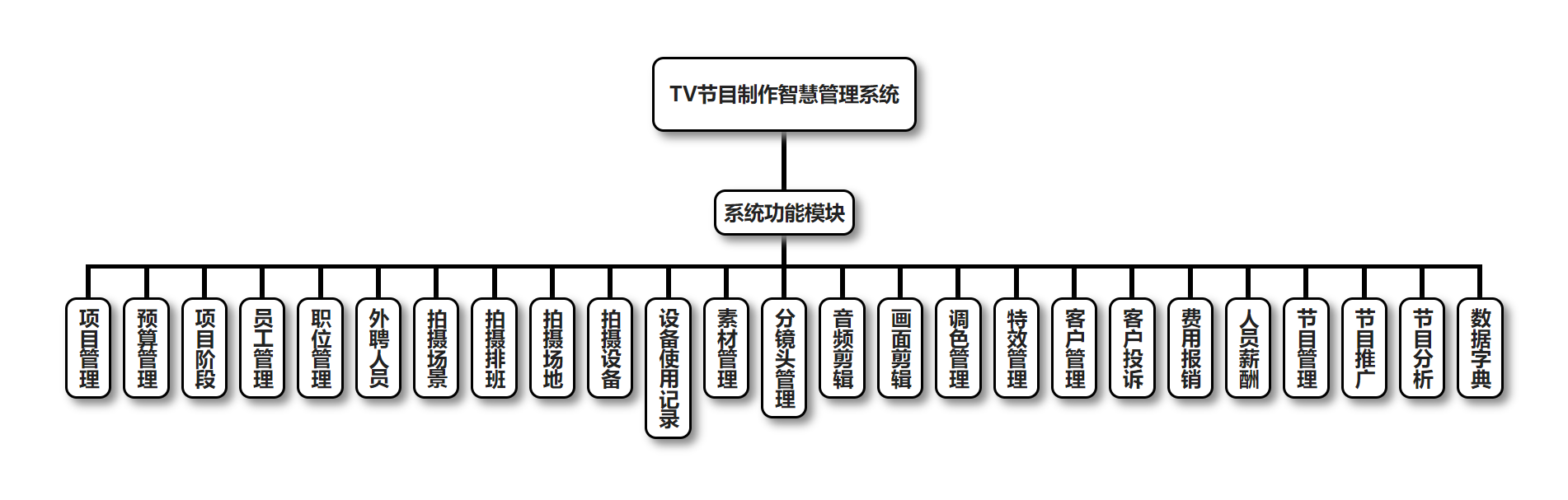 TV节目制作智慧管理系统的主要功能包括:项目管理、预算管理、项目阶段管理、员工管理、职位管理、外聘人员管理、拍摄场景管理、拍摄排班管理、拍摄场地管理、拍摄设备管理、设备使用记录管理、素材管理、分镜头管理、音频剪辑管理、画面剪辑管理、调色管理、特效管理、客户管理、客户投诉管理、费用报销管理、人员薪酬管理、节目管理、节目推广管理、节目分析管理、数据字典管理。