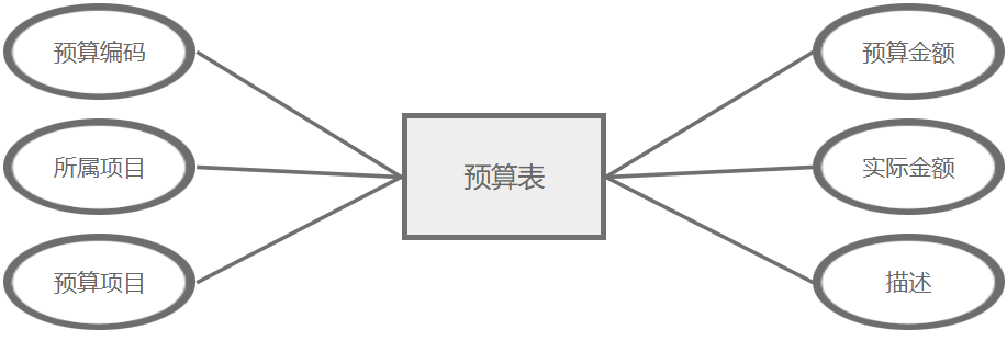 预算管理主要属性包括:预算编码、所属项目、预算项目、预算金额、实际金额、描述。