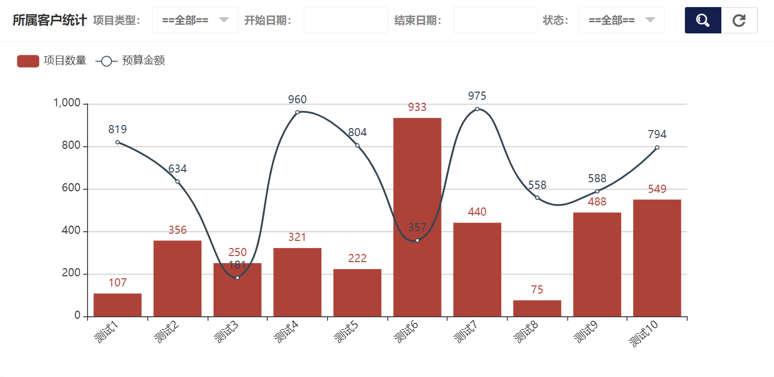 在项目统计中可以看到项目类型统计、所属客户统计、开始日期年统计、开始日期月统计、开始日期日统计、结束日期年统计、结束日期月统计、结束日期日统计、状态统计,所属客户统计如图所示: