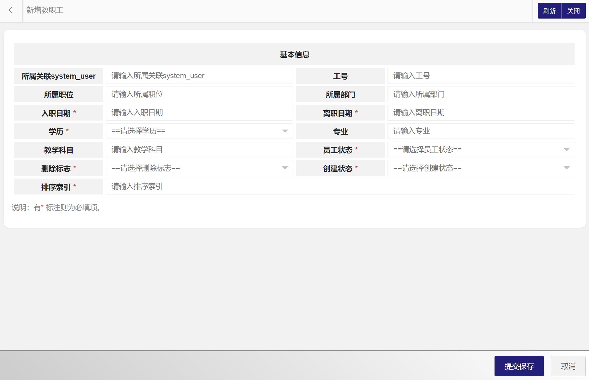 在教职工列表中可以选择新增教职工、编辑教职工、删除教职工、搜索教职工等。教职工属性包括:教职工编码、所属关联system_user、工号、所属职位、所属部门、入职日期、离职日期、学历、专业、教学科目、员工状态、删除标志等。新增教职工界面如图所示: