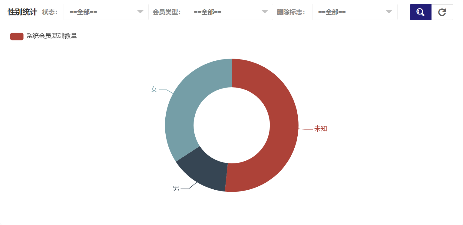 在系统会员基础统计中可以看到性别统计、状态统计、会员类型统计、删除标志统计,性别统计如图所示: