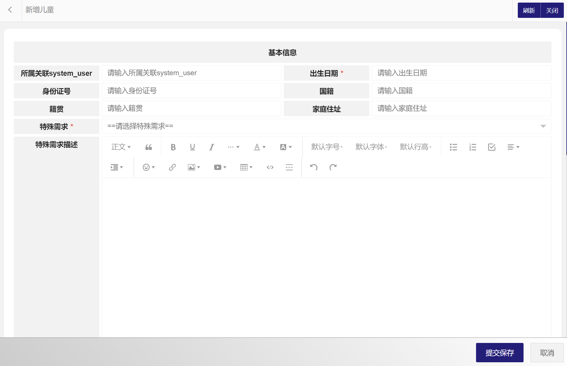 在儿童列表中可以选择新增儿童、编辑儿童、删除儿童、搜索儿童等。儿童属性包括:儿童编码、所属关联system_user、出生日期、身份证号、国籍、籍贯、家庭住址、特殊需求、特殊需求描述、健康状况、过敏信息、监护人姓名、与儿童关系、监护人电话、删除标志等。新增儿童界面如图所示: