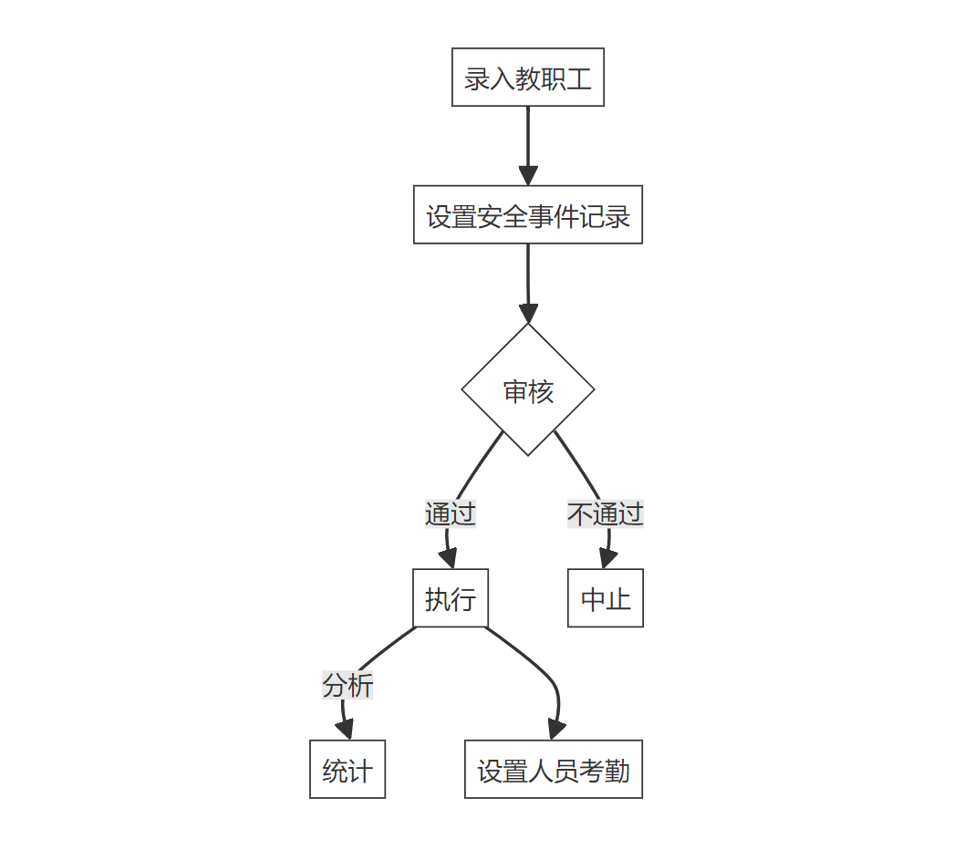 教职工管理角色用例:普通员工录入数据,审核员进行审批。具体模块描述如下:教职工基本信息维护(工号、职位等),入职离职记录管理,教学科目分配与调整,部门调动更新。
