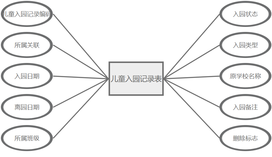 儿童入园记录管理主要属性包括:儿童入园记录编码、所属关联child_child_info、入园日期、离园日期、所属班级、入园状态、入园类型、原学校名称、入园备注、删除标志。