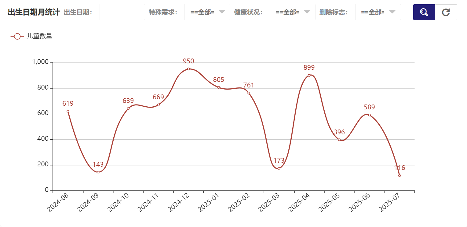 在儿童统计中可以看到出生日期年统计、出生日期月统计、出生日期日统计、特殊需求统计、健康状况统计、删除标志统计,出生日期月统计如图所示: