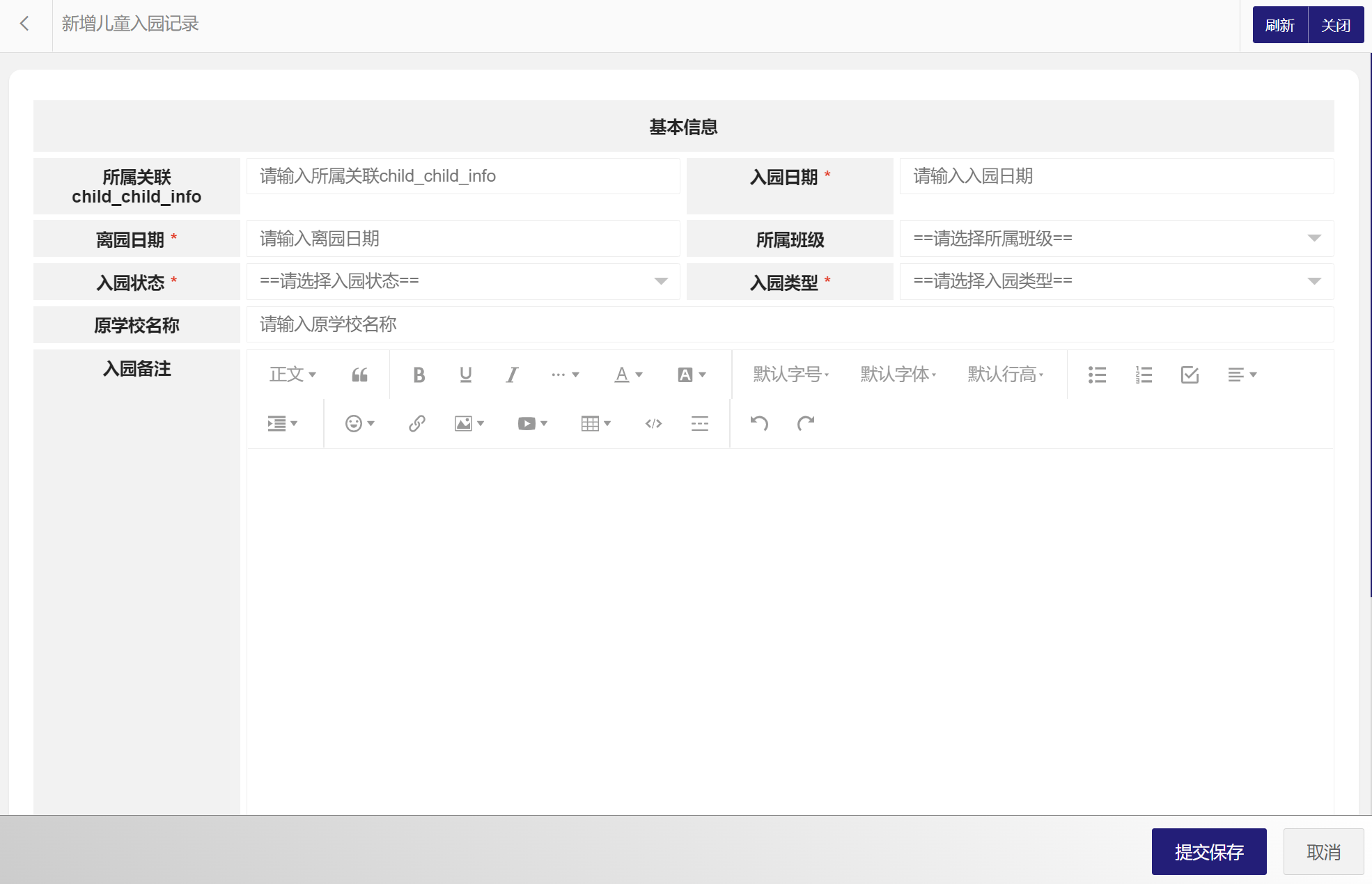 在儿童入园记录列表中可以选择新增儿童入园记录、编辑儿童入园记录、删除儿童入园记录、搜索儿童入园记录等。儿童入园记录属性包括:儿童入园记录编码、所属关联child_child_info、入园日期、离园日期、所属班级、入园状态、入园类型、原学校名称、入园备注、删除标志等。新增儿童入园记录界面如图所示: