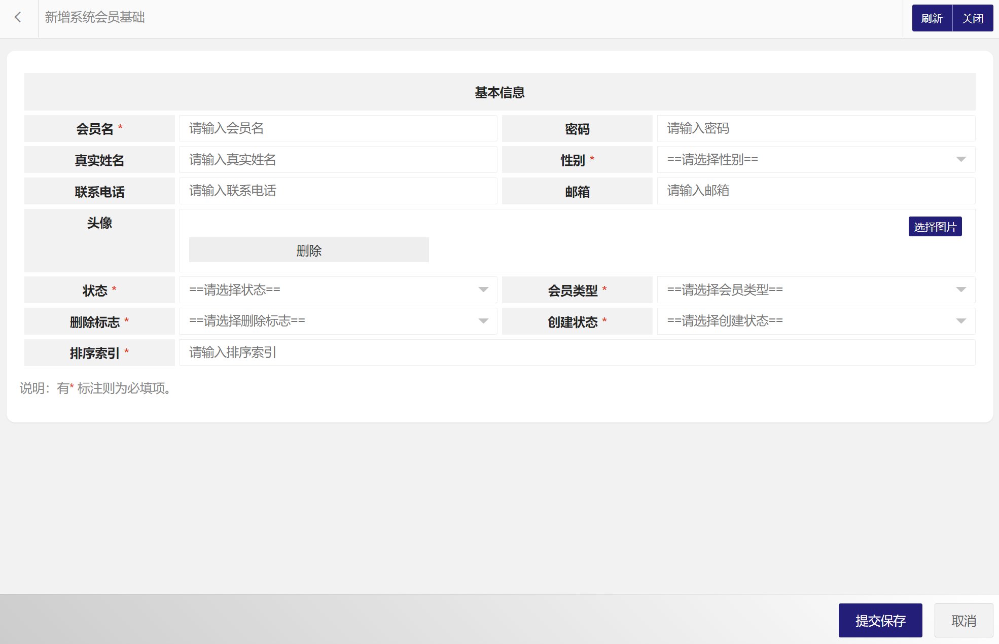 在系统会员基础列表中可以选择新增系统会员基础、编辑系统会员基础、删除系统会员基础、搜索系统会员基础等。系统会员基础属性包括:系统会员基础编码、会员名、密码、真实姓名、性别、联系电话、邮箱、头像、状态、会员类型、删除标志等。新增系统会员基础界面如图所示: