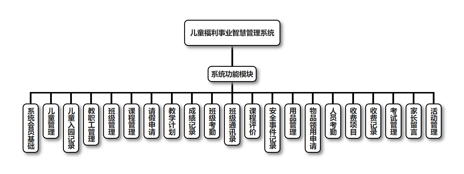 儿童福利事业智慧管理系统的主要功能包括:系统会员基础管理、儿童管理、儿童入园记录管理、教职工管理、班级管理、课程管理、请假申请管理、教学计划管理、成绩记录管理、班级考勤管理、班级通讯录管理、课程评价管理、安全事件记录管理、用品管理、物品领用申请管理、人员考勤管理、收费项目管理、收费记录管理、考试管理、家长留言管理、活动管理。